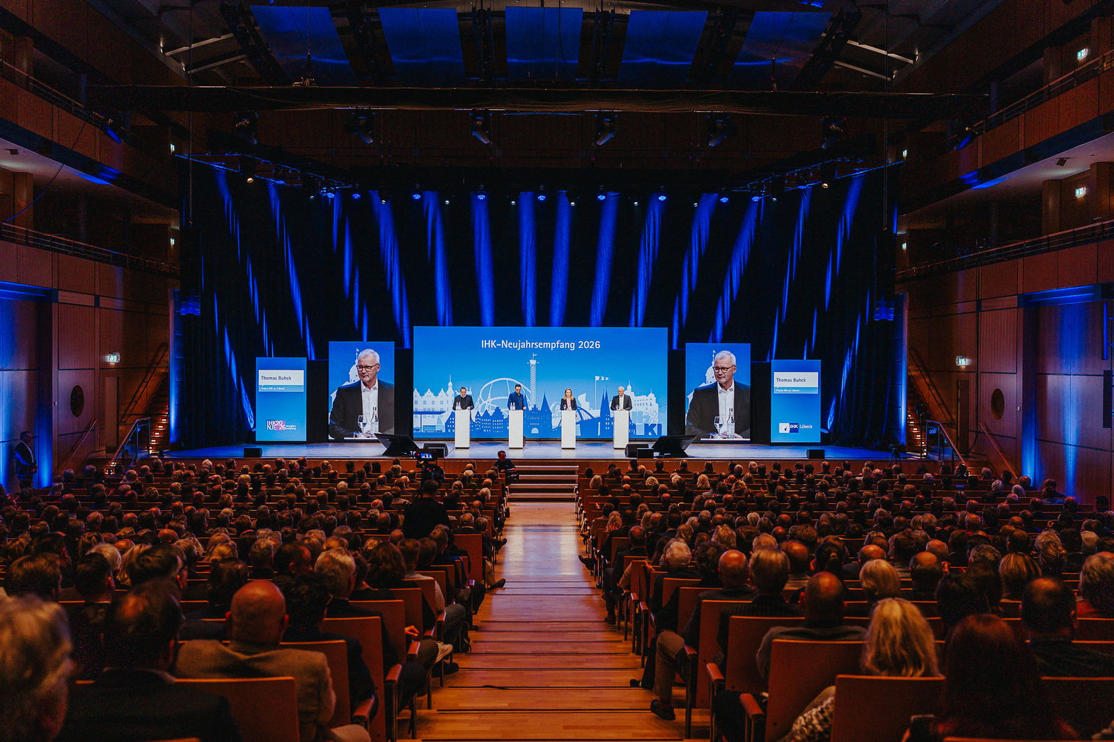 Mehr als 1.100 Vertreterinnen und Vertreter aus Unternehmen, Politik, Verwaltung, Wissenschaft, Bundeswehr und öffentlichem Leben nahmen an der Veranstaltung in der Musik- und Kongresshalle teil. IHK-Präses Thomas Buhck sieht ebenso wie Straubhaar gute Chancen für die Wirtschaft im Hansebelt. „Es bedarf einer guten Portion Mut, Vertrauen und Besinnen auf die eigenen Stärken sowie des Glaubens an die Zukunft.“ Mut erwarte er vor allem von der Politik, wenn es darum gehe, den Reformstau in den Bereichen Innovationsfähigkeit, Rente, Pflege und Gesundheit abzubauen. „Die Wirtschaft braucht Verlässlichkeit bei den wirtschaftspolitischen Rahmenbedingungen, um wieder Vertrauen in den Standort und die Politik zu fassen.“